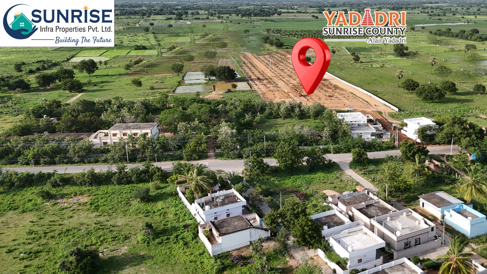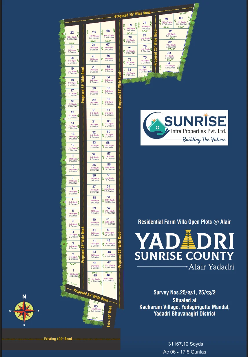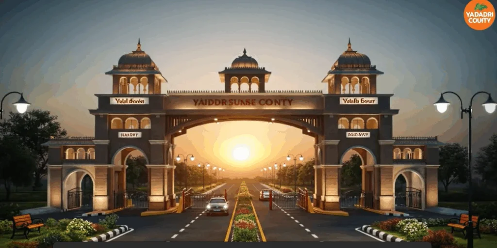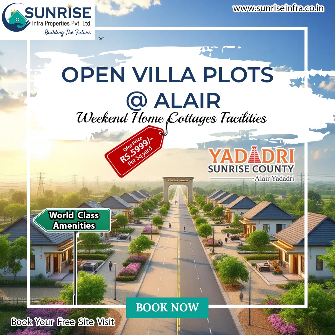 Yadadri Sunrise County offers residential farm villas and open plots in the serene location of Alair, providing a perfect blend of rural tranquility and modern conveniences. This development is designed for those seeking a peaceful retreat with all necessary amenities within easy reach.